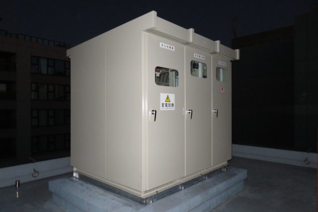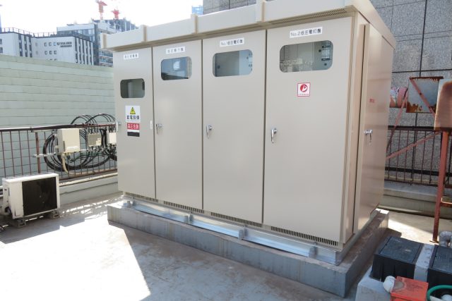 都内の有名繁華街にあるテナントビルの屋上キュービクルを更新しました。 夜中でも沢山の人やタクシーが行